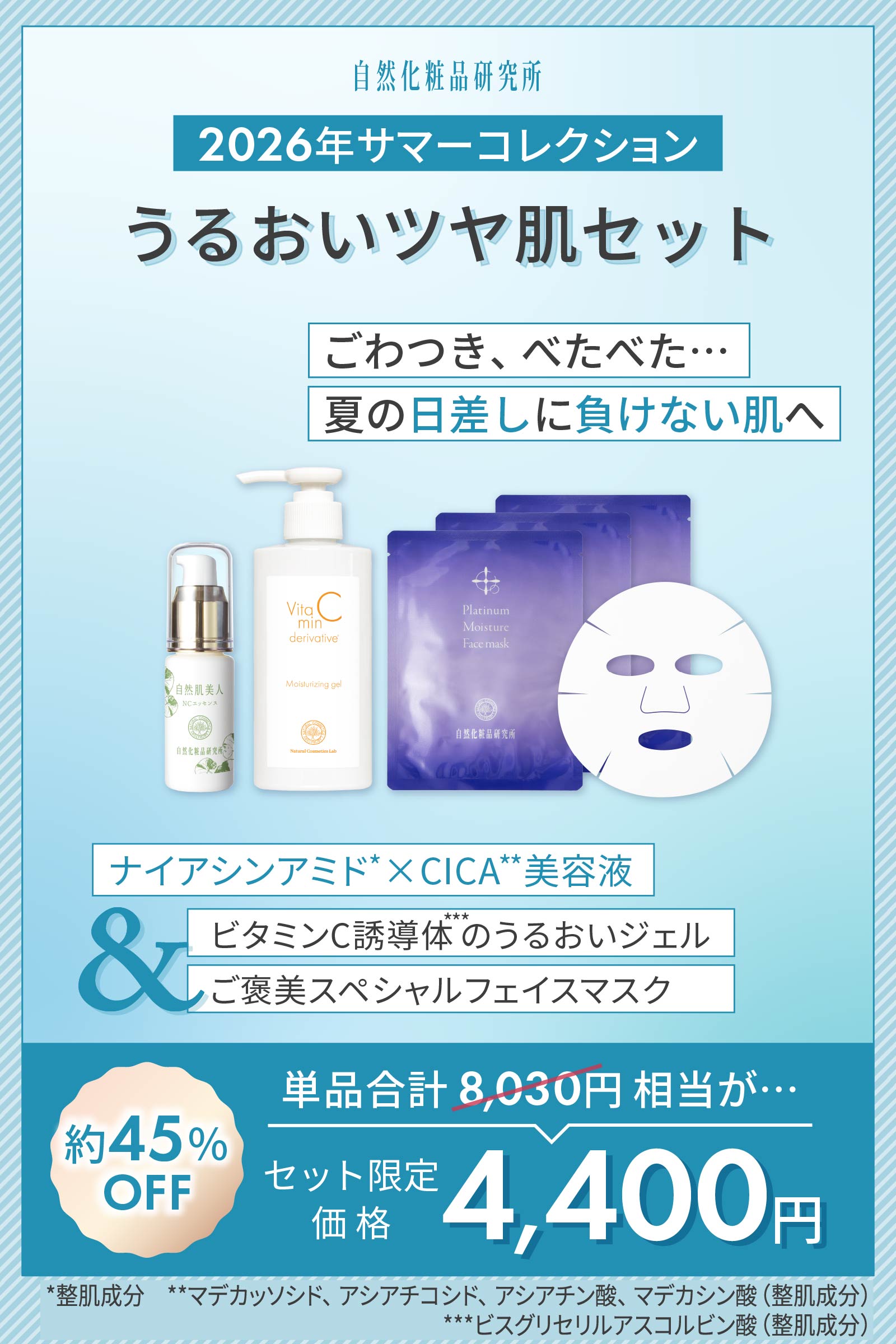 夏の隠れ乾燥肌を撃退。ゴワつきのない、うるツヤ肌にインナードライ肌をしっかりと保湿して、ハリ・ツヤを同時にケアできる3点セット。肌のコンディションを整えるナイアシンアミド*配合美容液の自然肌美人NCエッセンスに、ビタミンC誘導体**ジェルとプラチナ***モイスチャーフェイスマスクをプラス。うるおいが肌の角質層まで浸透して、みずみずしく明るい印象へ導きます。 季節の変わり目のゆらぎ対策にもおすすめです。*整肌成分 **ビスグリセリルアスコルビン酸(整肌成分) ***白金(整肌成分)