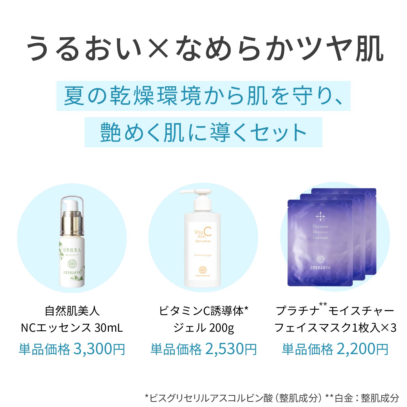 *整肌成分 **ビスグリセリルアスコルビン酸(整肌成分) ***白金(整肌成分)