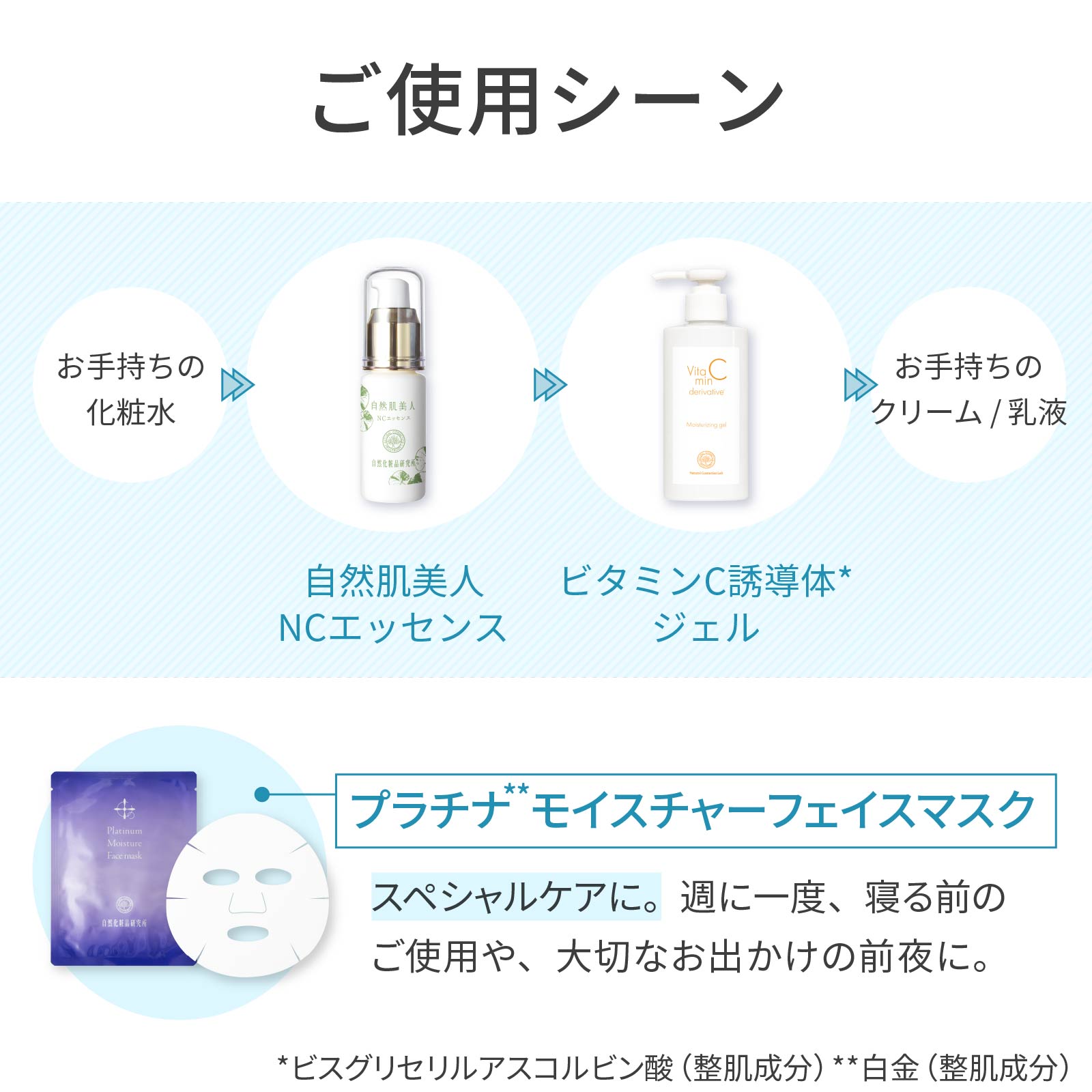肌のコンディションを整えるナイアシンアミド*配合美容液の自然肌美人NCエッセンスに、ビタミンC誘導体**ジェルとプラチナ***モイスチャーフェイスマスクをプラス。